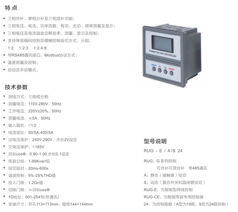 RUG 系列大屏显示多功能自动控制器适用于无功控制输出12 路,具有RS-485 通讯接口,支持 MODBUS 通讯协议,为采用128x64中文LCD液晶显示器,交流采样,谐波保护,具有三相、分相、综合补偿三种控制方式,可实现显示测量系统L1、L2.3每相功率因数、电压、电流、有功功率、无功功率、总谐波畸变率、频率、时间,无功控制具有过压、欠压、缺相、电压谐波越限保护功能,所有设置数据可通过后台管理软件,设置数据掉电不丢失。